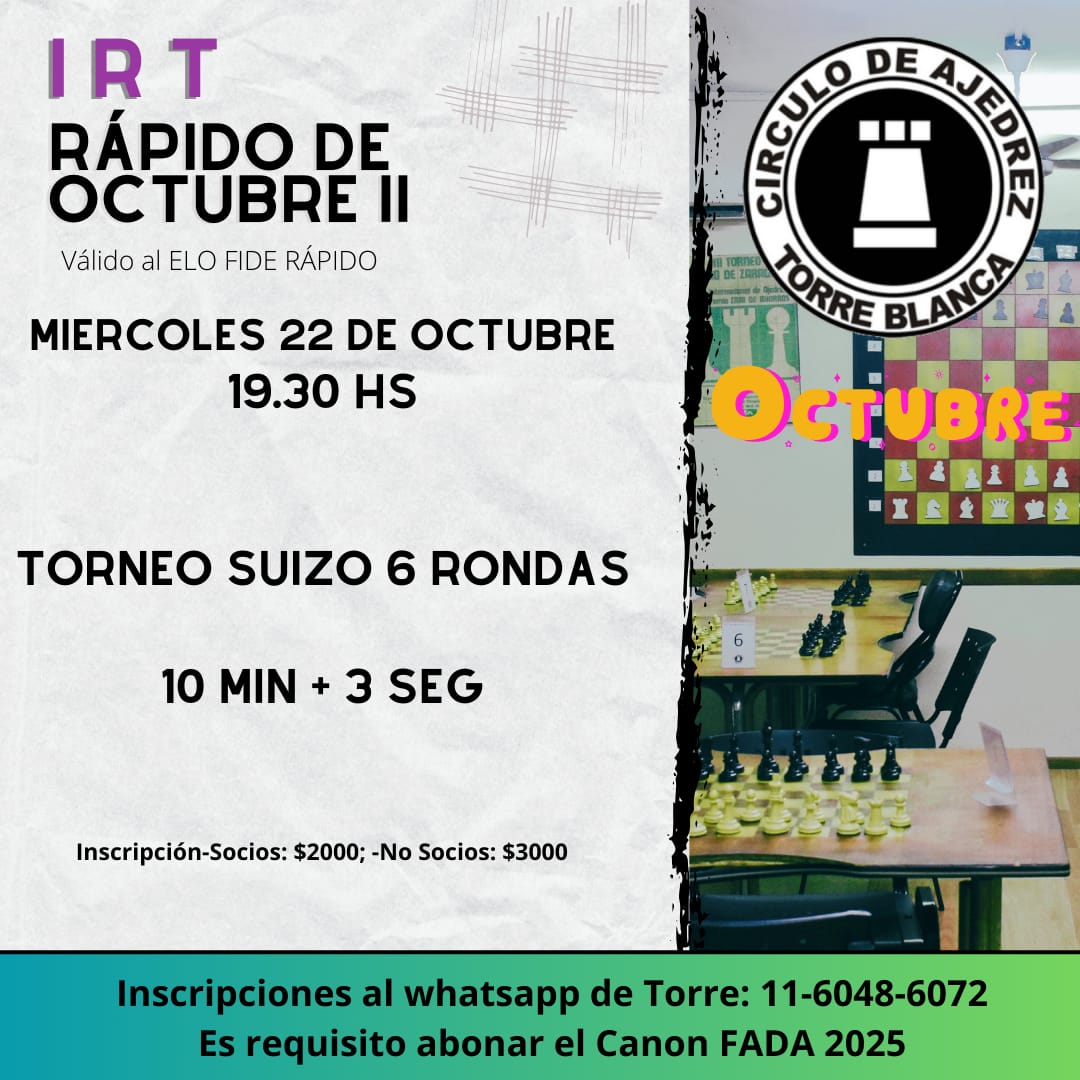 Válido al ELO FIDE Rápido – Ideal para entrenarse para los campeonatos Metropolitanos y los clasificatorios a los campeonatos Argentinos Viernes 10 de Octubre (Feriado) 16 hs.