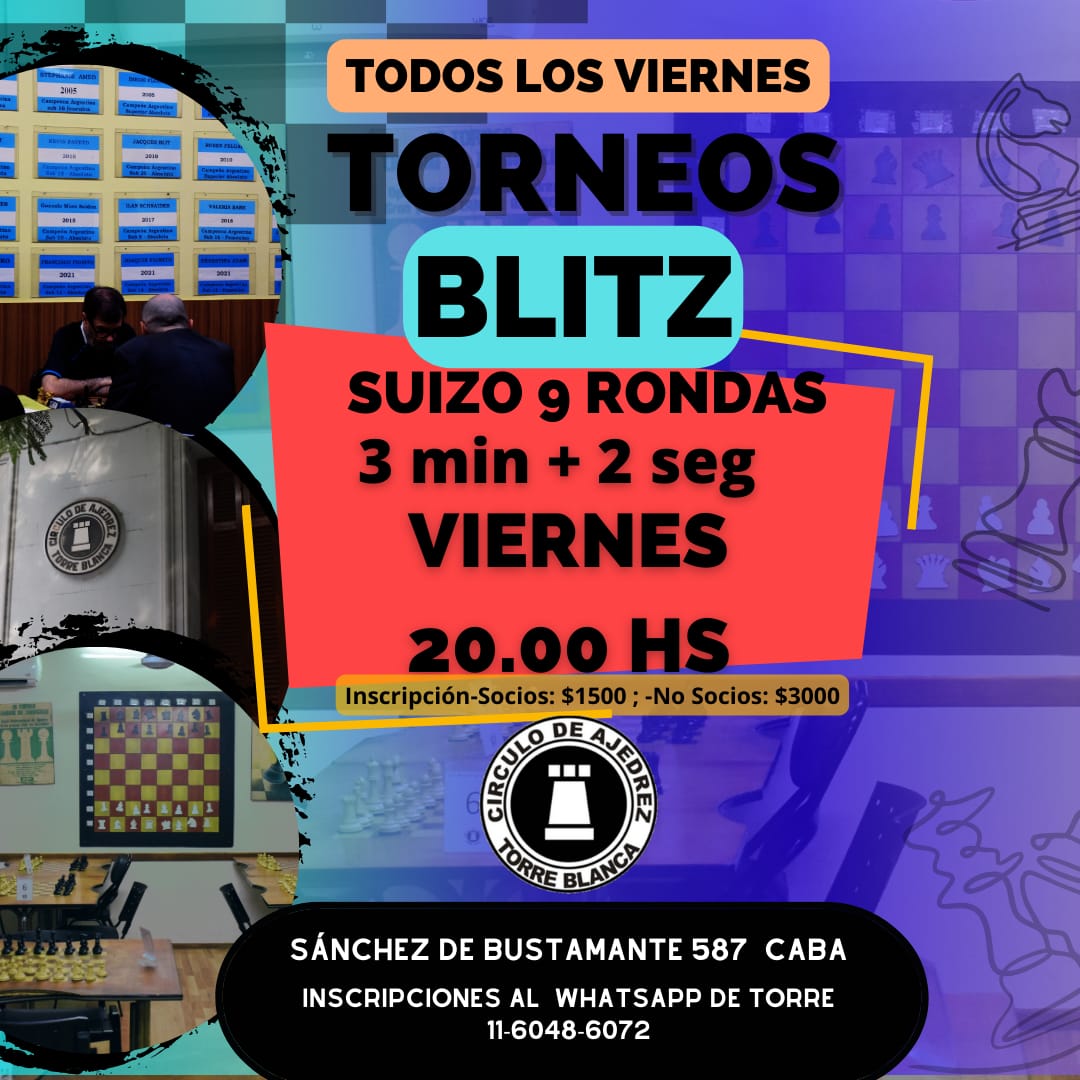 Todos los viernes a las 20hs – Sistema suizo a 9 rondas – 3 min. + 2 seg. por jugada. Inscripción: