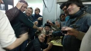 Ultima visita a Torre de Ricardo Marginet (ex miembro de CD fallecido en 2021). A la izquierda, Hernán Flamhum, Marginet, Gustavo Groesman. A la derecha, Gabriel Romanelli, Diego Salvati Izquierda al fondo, Plotinsky abriendo una botella de vino y demostrando que los dirigentes de Torre son todo terreno